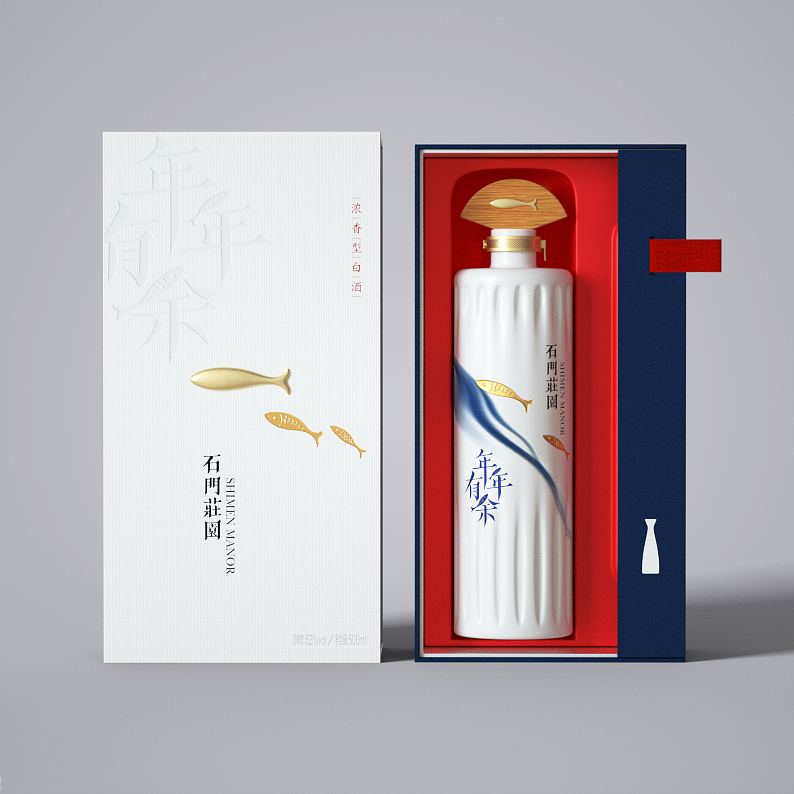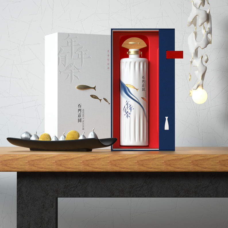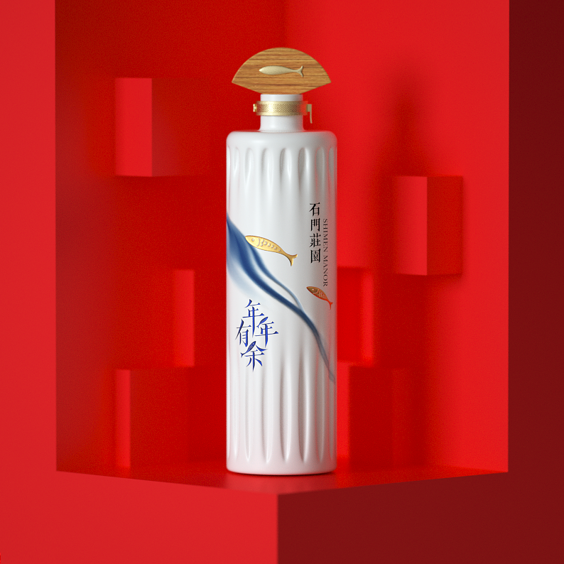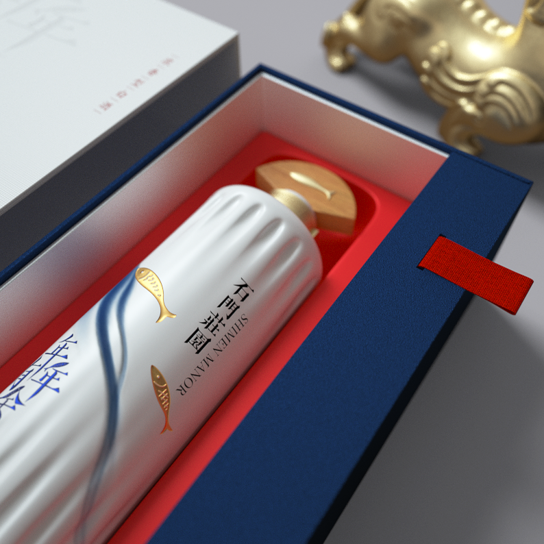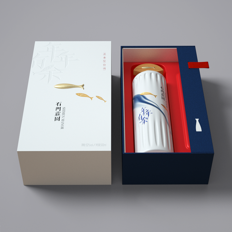 The theme of Shimen manor is“Having more than need every year”, it’s targeted at high-end consumers. The concept of “Having more than need every year” is the yearning and blessing of Chinese people for a better life. Chinese liquor culture and liquor making technology have a long history of more than 3000 years. How to innovate on the basis of Chinese tradition and how to make the white wine packaging shine the light of the times are the problems to be solved by BoFly Design. Modeling, material, technology, etc. are all creative points that can be mined. Chinese traditional elements have different feelings through the use of modern design and visual performance. Now you can feel the artistic charm of modern white wine packaging through creative works!