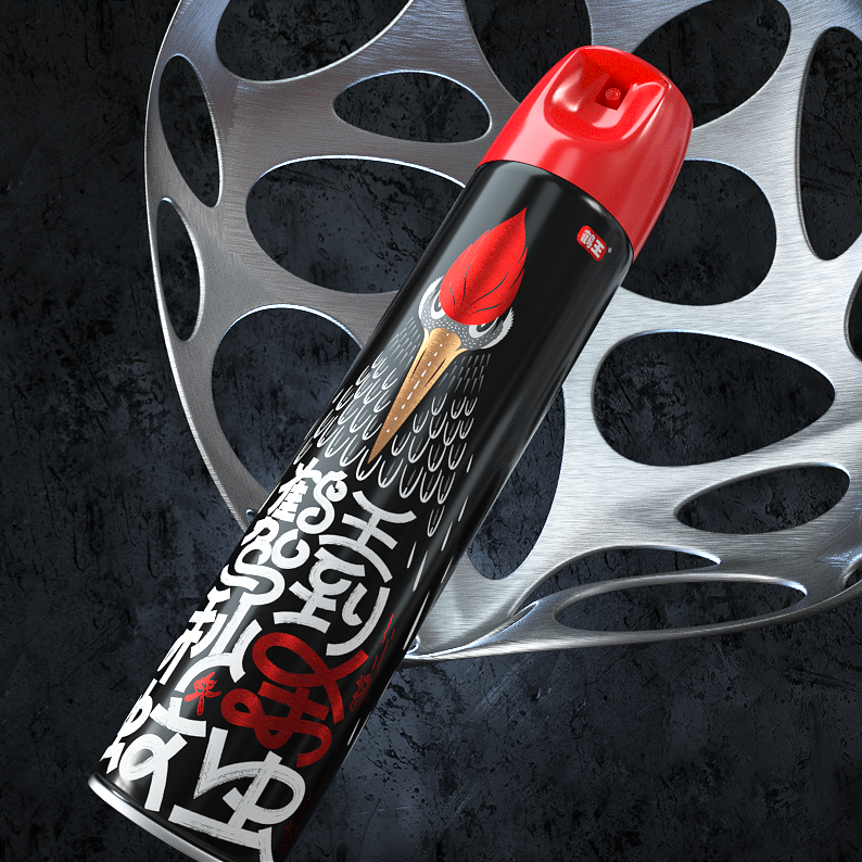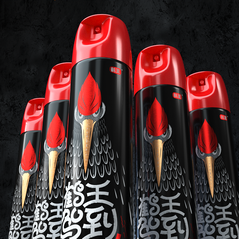 鶴王,顧名思義,鶴立雞群,王者也。通過(guò)現(xiàn)代藝術(shù)的插畫(huà)表現(xiàn)形式詮釋品牌,創(chuàng)意圖案由上至下為三角形,如按壓噴嘴瞬間的噴霧造形。