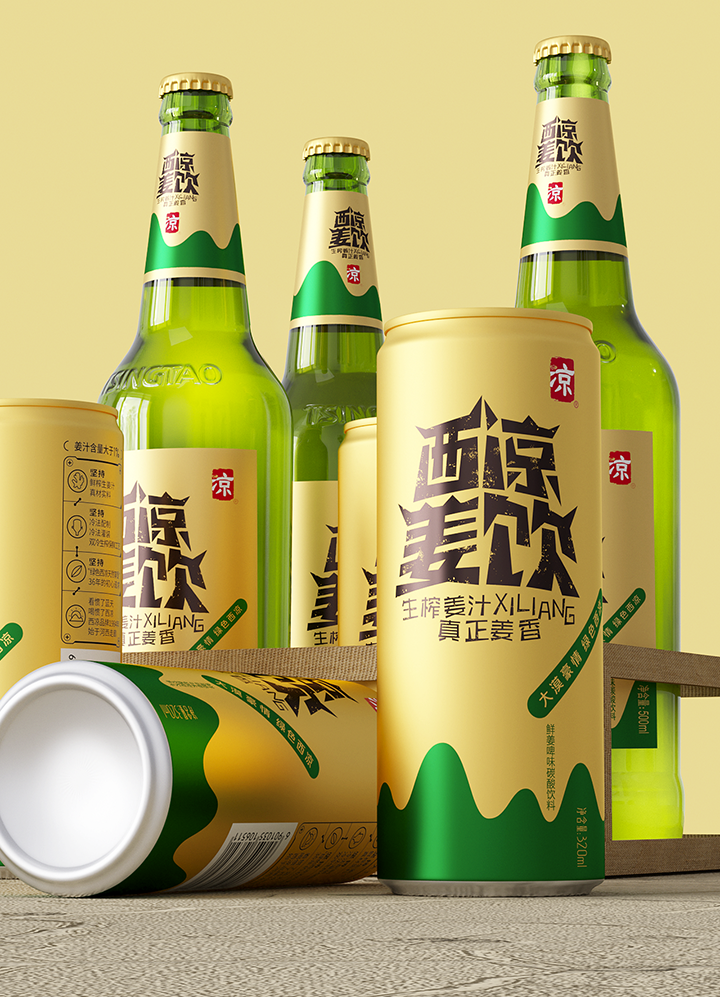Xiliang ginger drink adopts the traditional technology of raw ginger juice to ensure the quality and taste of the product. The creativity combines Jiayuguan, desert, oasis, ginger juice and other elements, the font design of the brand name is Jiayuguan shape, the golden tank body and oasis ingeniously combine to form the sense of golden ginger juice flowing down. Color and shape are oases in the desert, expressing the meaning of precious water source. The golden pot is like an endless desert, and the golden ginger juice forms a positive and negative shape with the lower oasis, which skillfully shows the feeling of golden ginger juice overflowing from the mouth of the jar. The new design gives a new image to Xiliang ginger drink, which has the personality of Northwest China and contains the characteristic positioning of the product.